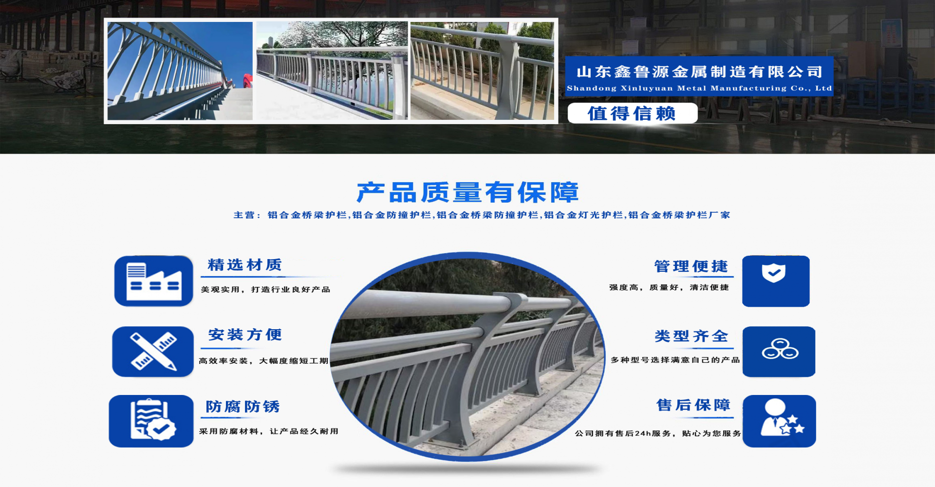 山東鑫魯源金屬制造有限公司主要經(jīng)營:鋁合金橋梁護(hù)欄,鋁合金防撞護(hù)欄,鋁合金橋梁防撞護(hù)欄,鋁合金燈光護(hù)欄,不鋁合金橋梁護(hù)欄廠家,環(huán)波梁橋梁護(hù)欄,環(huán)波梁防撞護(hù)欄。質(zhì)量可靠、經(jīng)濟(jì)實(shí)用的顯著特點(diǎn)。公司為客戶提供可靠售后保障,堅(jiān)持“以品質(zhì)立足、服務(wù)求發(fā)展”,愿與各界朋友精誠合作、攜手發(fā)展! 服務(wù)優(yōu)勢:真誠的服務(wù)理念、完善的服務(wù)體系。公司專業(yè)力量充足;工程案例眾多、從業(yè)經(jīng)驗(yàn)豐富;公司以可靠質(zhì)量的產(chǎn)品,合理的價(jià)格,完善的售后服務(wù),能夠滿足市場各個(gè)企業(yè)的需求?! ∑髽I(yè)精神:執(zhí)著追求 持續(xù)創(chuàng)新執(zhí)著追求,就是堅(jiān)持不懈、堅(jiān)定從容,專注于自己的事業(yè),把能做的事情做好,不斷克服困難、把握機(jī)遇,贏得未來?! 〕掷m(xù)創(chuàng)新,就是生命不息、創(chuàng)新不止,通過持續(xù)實(shí)施技術(shù)創(chuàng)新、管理創(chuàng)新、市場創(chuàng)新,獲取持續(xù)的競爭優(yōu)勢。...